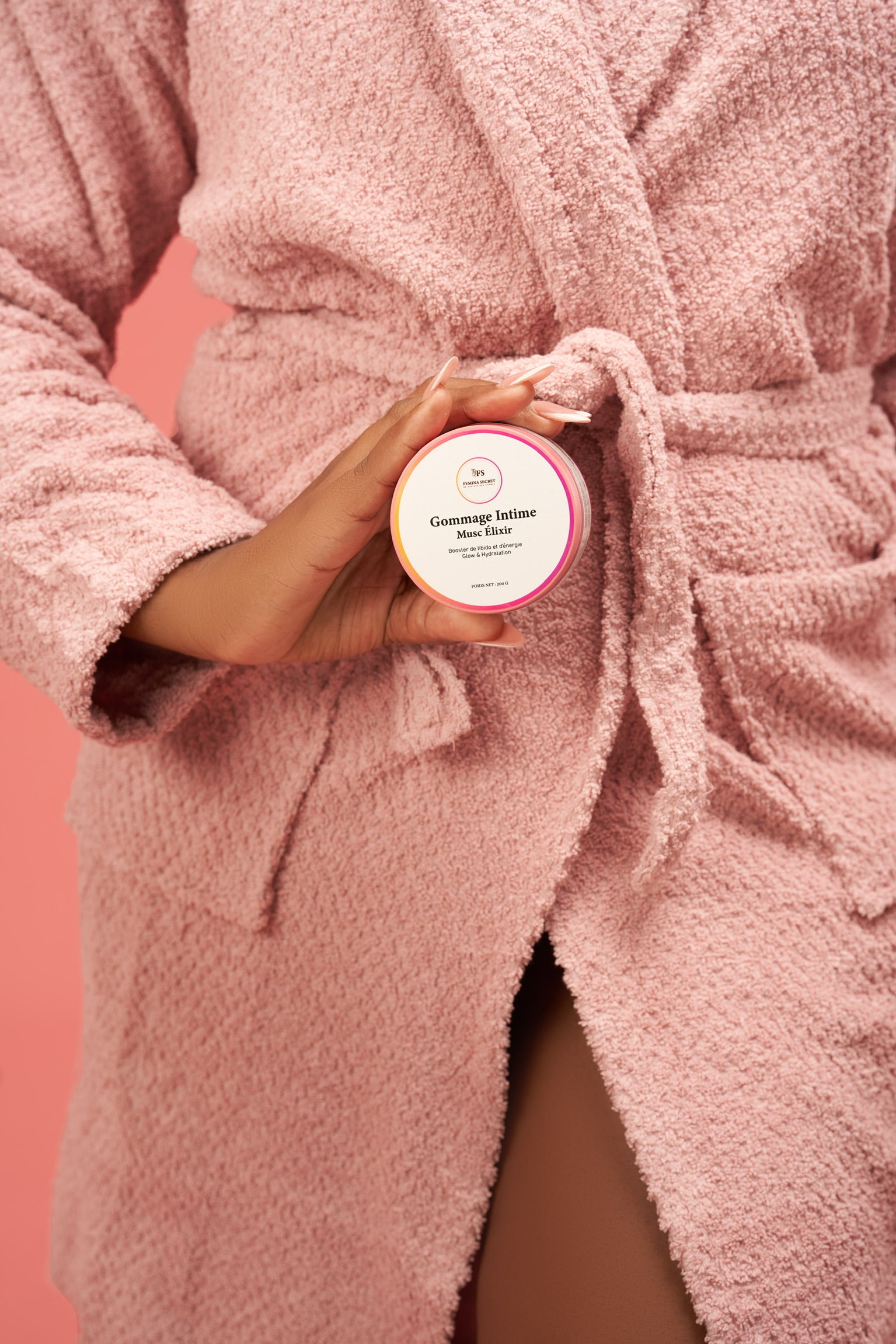 Soin exfoliant doux spécifiquement conçu pour la zone intime du corps. Il s'agit d'un traitement qui vise à éliminer les cellules mortes de la peau tout en respectant la sensibilité de cette zone délicate. Ce type de soin peut être utile pour améliorer la texture de la peau, prévenir les poils incarnés et maintenir une hygiène intime optimale.